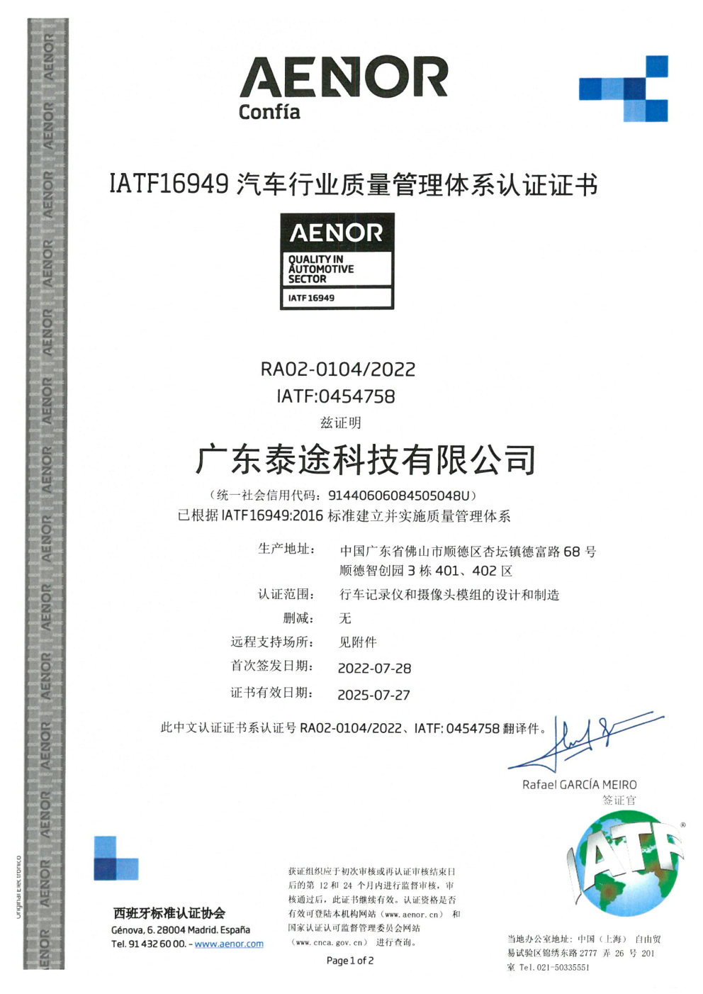 經(jīng)權(quán)威認(rèn)證機(jī)構(gòu)審核通過(guò),我司廣東泰途科技有限公司再次順利通過(guò)了IATF16949:2016質(zhì)量管理體系認(rèn)證,并在2022年7月28日正式拿到該證書(shū)。通過(guò)該體系的認(rèn)證,表明我司在行車(chē)記錄儀和攝像頭模組的設(shè)計(jì)和制造全面符合IATF16949:2016汽車(chē)行業(yè)質(zhì)量管理體系的要求,取得IATF認(rèn)證標(biāo)志著我司的產(chǎn)品獲得了進(jìn)入汽車(chē)市場(chǎng)領(lǐng)域的準(zhǔn)入綠色通行證,對(duì)進(jìn)一步拓展汽車(chē)產(chǎn)品業(yè)務(wù)產(chǎn)生積極影響。