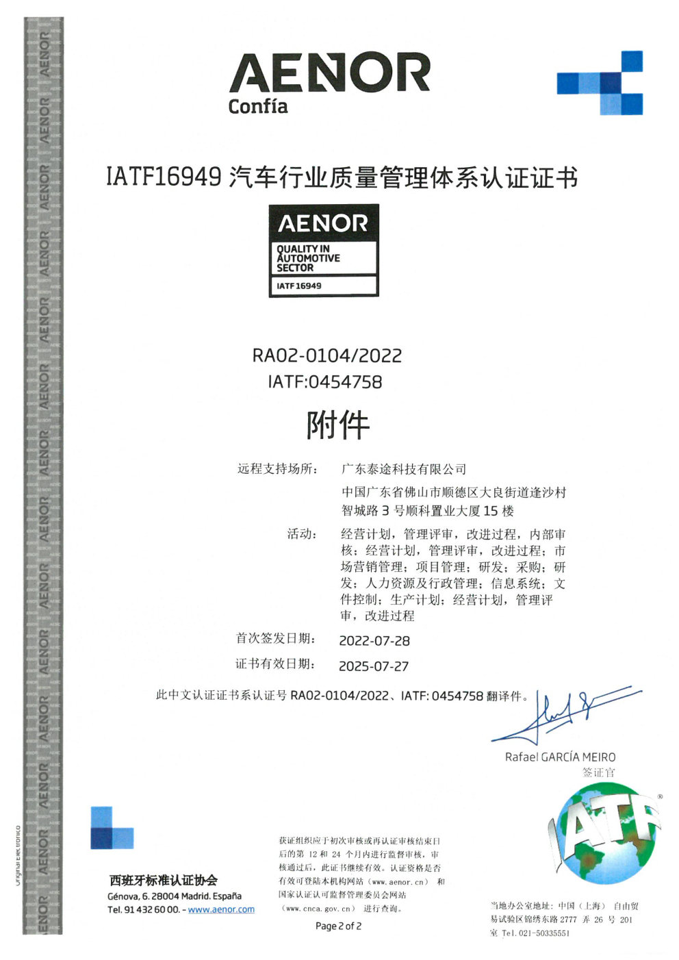 經(jīng)過(guò)嚴(yán)格審查,我司廣東泰途科技有限公司(原:廣東信科電裝科技有限公司)順利通過(guò)了IATF16949:2016質(zhì)量體系認(rèn)證, 并在2019年4月3日正式拿到該證書(shū)。這標(biāo)志著我司的產(chǎn)品獲得了進(jìn)入汽車(chē)市場(chǎng)領(lǐng)域的綠色通行證,為公司日后的蓬勃發(fā)展奠定了堅(jiān)實(shí)的基礎(chǔ)。